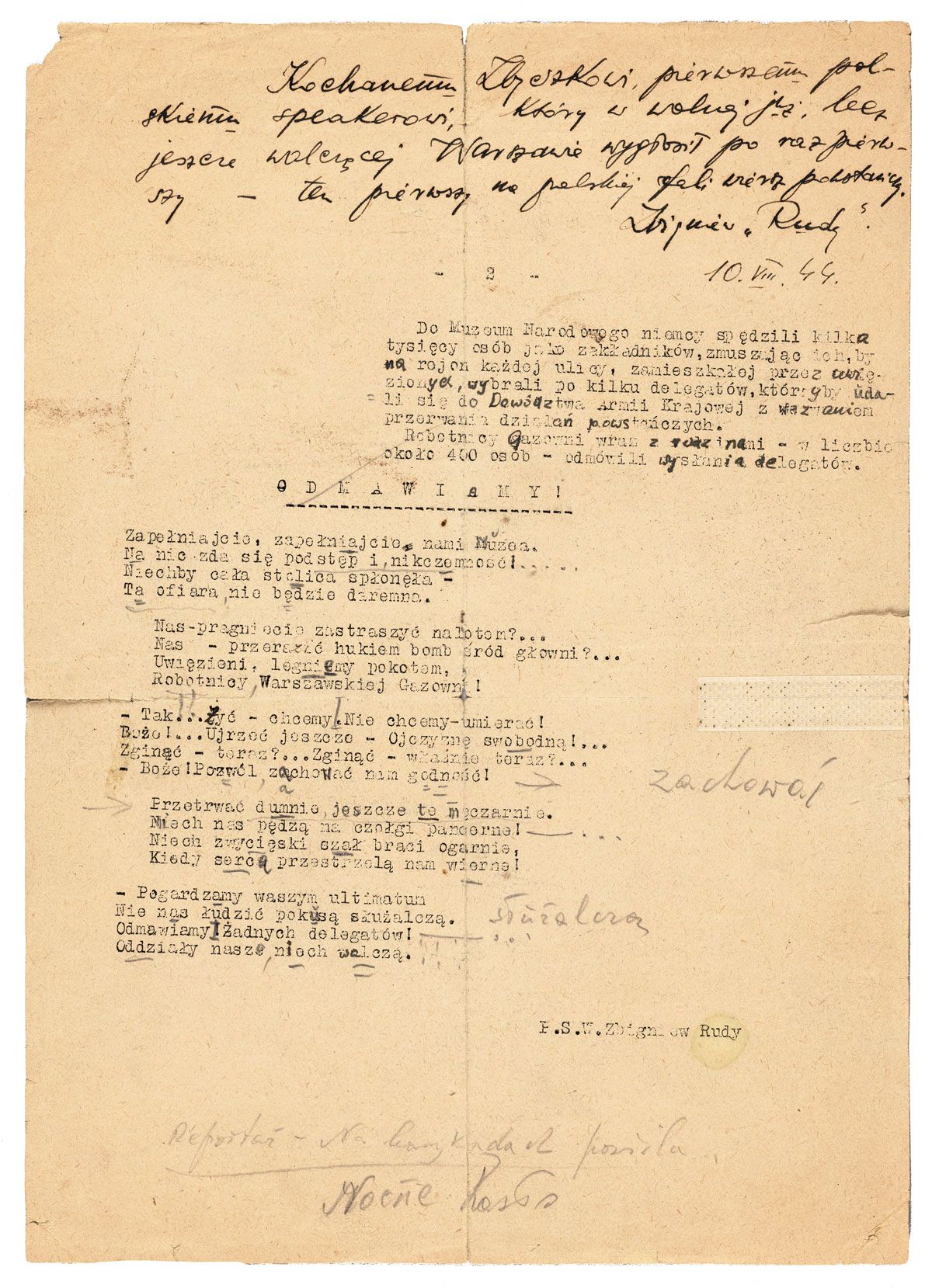 Tytułowa strona dodatku nadzwyczajnym pisma informacyjnego AK „Warszawa Walczy” 1944, nr 26, z inskrypcją autora wiersza p.t. Odmawiamy! dla „Krzysztofa” [Zbigniewa Świętochowskiego], opatrzony podpisem „PSW Zbigniew Rudy” Fot. ze zbiorów Muzeum Warszawy, MHW A/V/804.
